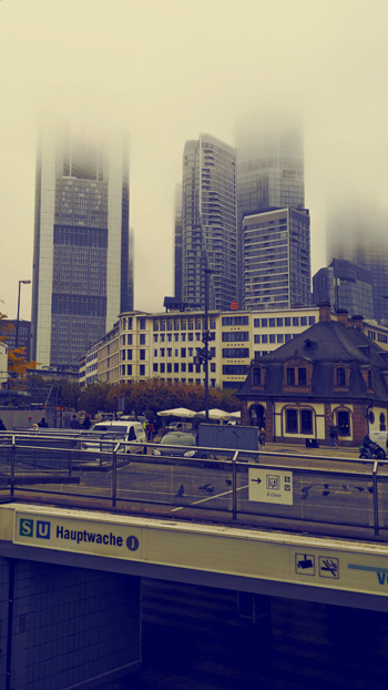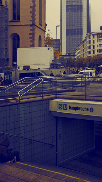 | 916 PHOTO MODE – Hauptwache Frankfurt (November 2025) Mit meinem Smartphone eingefangen und nachträglich farblich modifiziert. © streckov ! Bildstrecke von der nebelverhangenen Skyline aus am Roßmarkt, hinüber zum Anfang der Zeil, bis hinunter in den vorderen Untergrundbereich der Hautptwache B-Ebene. |